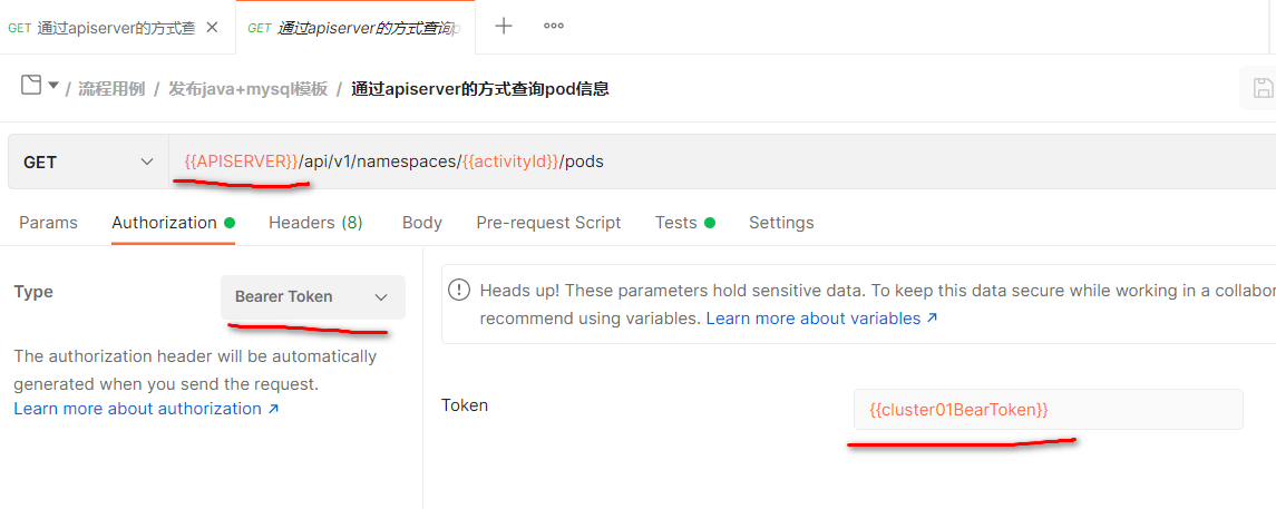 8、在Postman中添加请求,设置集合变量BearerToken和APIServer URL